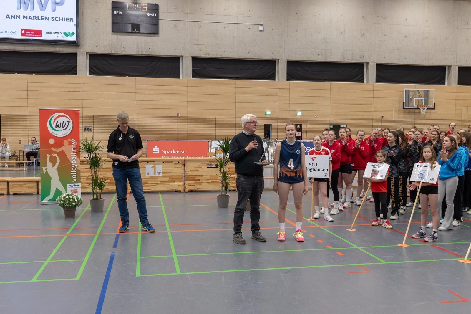 „Als Schirmherr der Westdeutschen Meisterschaften U16 möchte ich etwas Besonderes machen, vielleicht die fairste Mannschaft belohnen, oder die fairste Spielerin“? Die Frage an Achim Franke kam vom Altbürgermeister Richard Borgmann. Doch wie könnte man beide Gedanken in die Tat umsetzen? Ja, wenn es Fußball, Handball oder eine andere Sportart wäre. Bei den verschiedensten Turnieren wird immer wieder die MVP (wichtigste Spielerin) mit einer Medaille geehrt. Nein, es sollte schon ein Unikat sein. So beauftragte Herr Borgmann einen örtlichen Künstler, Herrn Jürgen Polenz, einen Preis zu entwerfen. Jeder Trainer oder jede Trainerin hatte Punkte vergeben und somit diese MVP ausgewählt. Es wurde wirklich ein Unikat, das Ann Marlen Schier, Spielerin vom TSC Münster-Gievenbeck, in Empfang nehmen durfte. Große Freude und Resonanz kam aus Münster. Herzlichen Dank an den Altbürgermeister von Lüdinghausen.